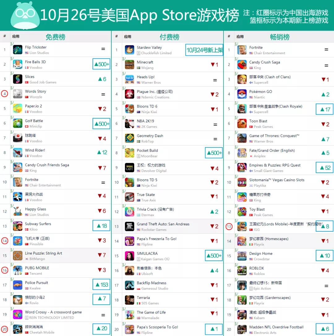 先来看看免费榜的情况,本期美国市场免费榜共有6款新上榜游戏,其中 排名上升了20位之后排在第20的《砖块消消消》是来自中国厂商出海游戏 。此外, 《Words Story》、《飞机大亨》和《PUBG MOBLIE》3款前辈也未跌出前20。