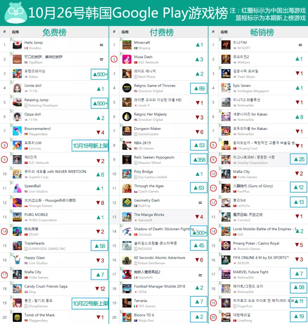 正如开篇所言, 本期的韩国市场榜单变化非常明显 ,3个榜单上中游均有新面孔出现。先来看看免费榜方面,本期新上榜的6个游戏中,有两个是新上市的游戏,排名变化最明显的则是Top3以及Top5两个。值得注意的是, 排名第8的《포트리스M》是中国新出海的益智类游戏 。除了《포트리스M》之外, 本期免费榜上的中国出海游戏还有3个 。