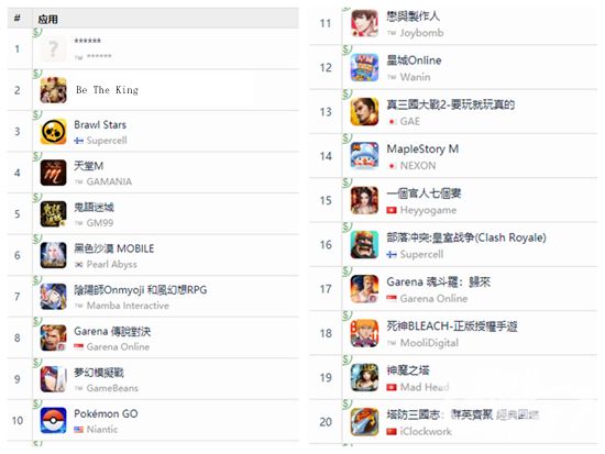 11月台湾手游市场收入榜