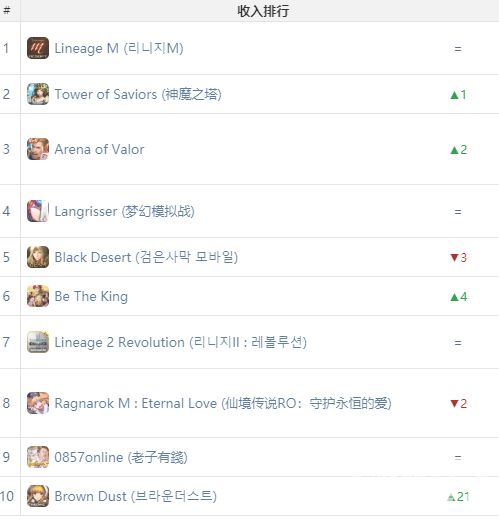 在收入榜上,《天堂M》力压《神魔之塔》和《王者荣耀》排名第一。前十中,还有另一款《天堂》 IP 的游戏《天堂 2 :革命》,排名第 7 。前十中还有两款韩国端游 IP 改编的游戏,包括《黑色沙漠》、《 RO 仙境传说》。一定程度上体现了韩国过去的经典 IP 强大的号召力。