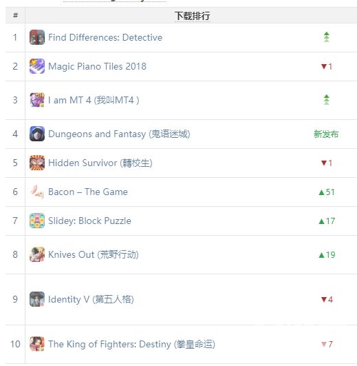 在11月下载榜上, Faston 的休闲新游戏《 Find Differences: Detective 》上线后再度迅速蹿红,接力《 Hello Cats 》拿下 70 个国家第一。 Faston 类似玩法的还有《 Find Differences: Her Secret 》、《 Find Differences: Prank 》、《 Find Differences: The Murderer 》等等一些列游戏。 Eyou 的《梦幻钢琴 2018 》、《我叫 MT4 》和《鬼语迷城》等游戏分列第二到第四位。