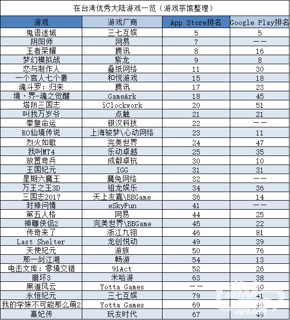 在台湾地区榜单上,来自大陆的游戏依然占据主流。App Store和 Google Play 双榜上,共有 34 款游戏。