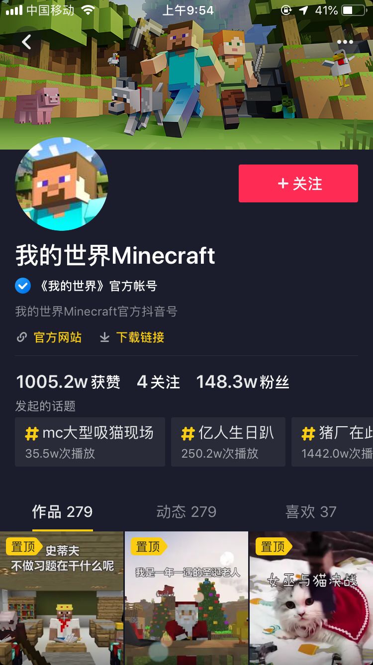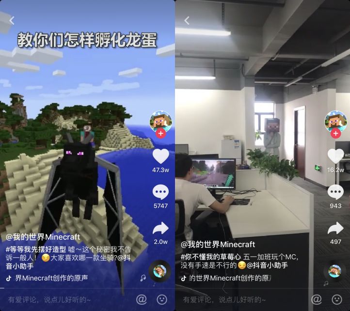 《我的世界》作为自由冒险的沙盒游戏,玩家可以在其中让所有的天马行空成为可能,而其官方抖音号也充满了各种有趣的脑洞。自发出第一个视频迄今,《我的世界》官方抖音播放上亿,获赞已破1000万,收获148W粉丝,更数次被抖音官方作为案例展示。