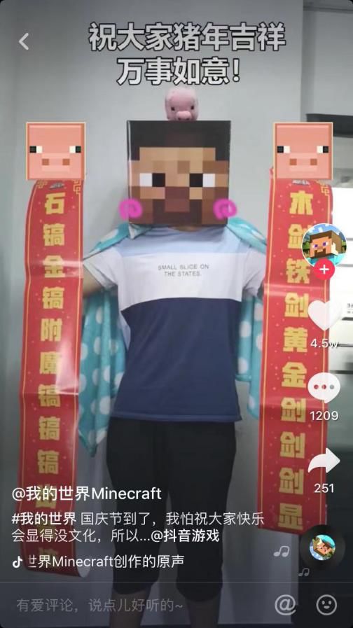 从史蒂夫跳海草舞到MC土味情话,从裂屏动态壁纸到万圣节、感恩节一个不落下……《我的世界》官方抖音在追热点的同时不忘融入游戏特点,如在结合国庆节热点的视频中,史蒂夫提前祝大家猪年快乐,并且露出了《我的世界》对联、公仔等与游戏有深度关联的物品,这些抖音热点内容不仅吸引了非游戏用户的关注,使游戏品牌在抖音用户中成功扩散,更能成功引流潜在玩家,实现对游戏的转化。