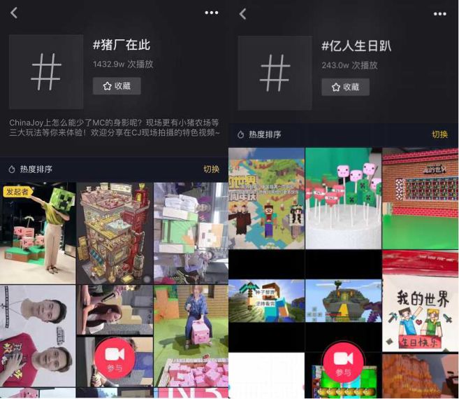 《我的世界》中国版官方抖音发起的话题皆数据抢眼,其中#猪厂在此#和#亿人生日趴#分别有1432.8万次和243.3万次播放。其中,猪厂作为网易一大标签,一直被大众花式讨论,猪也是极受抖音用户欢迎的元素,而本次以#猪厂在此#作为抖音话题,无疑切中了抖音用户的兴趣点。在线上,官方率先发出与“猪”场景有关的趣味视频,激发用户对“猪”的联想;在线下,《我的世界》于ChinaJoy现场设置“抖音互动福利加码”,用网红场景激发用户进行自我展示。线上线下引导用户深度卷入,刺激用户自发产出内容并二次传播,深度激发“自来水”。