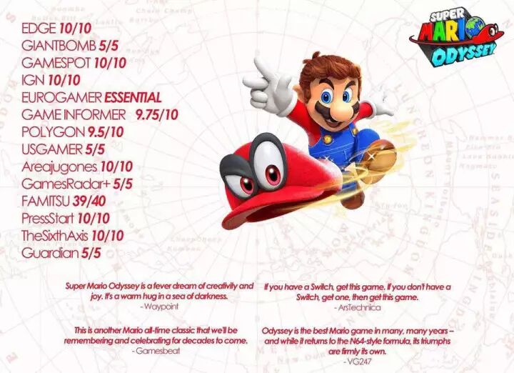和《原谅帽大作战》一样,同样注重风骚的走位,同样里面的帽子系统是游戏的亮点,没错,还是那个永远带着红色帽子的意大利水管工大叔,此次他参与的作品正是这几天各个权威游戏媒体给予满分的游戏——《超级马里奥奥德赛》。在亚马逊上,仅凭预售销量就超过了《塞尔达传说:荒野之息》成为了今年销量第二高的游戏。