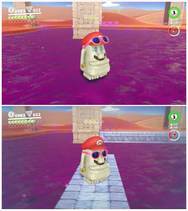 没错,又是一种鼓励玩家去进行探索的开放式模式,理论上,马里奥需要通过不断得探索,从而收集到足够多的“月亮”,方可进入下一个国家,只有进入下一个国家,才能够推动游戏的进程,这也意味着离最终的英雄救美更近一步。