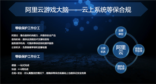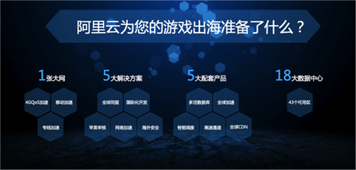 等保合规近两年大家关注的也较多,国家也加强了对整个互联网信息安全的监管力度,从长期来讲,无论是对于自己的业务安全,还是应对合规上的要求,等保合规都会逐渐被大家所认知和认同。阿里云除了能够提供一站式安全等保合规评估之外,阿里云提供的所有安全服务组件可以很好的满足等保合规的要求。 三、阿里云游戏大脑——游戏出海 对于游戏出海,阿里云提供了1张大网、5个解决方案、5大配套产品和18大数据中心的支撑。1张大网是指阿里云全球数据中心之前组建的环形网络,可以实现全球数据中心互联互通,实现灵活的访问流量调度。