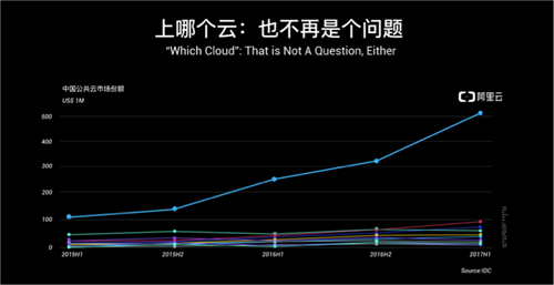 大家可以看到这张曲线上面,阿里云现在在整个中国公共云市场里面的市场份额已经占据了绝对的领先地位,这个比例也充分证明了整个行业客户对于阿里云的认同,今天有越来越多像传统政府、金融、医疗这些原来我们看似不可能上云的企业都已经将他们最核心的业务放在阿里云云上,这个发展趋势很好的表现了阿里云在公共云市场中成熟度不断提升的过程。