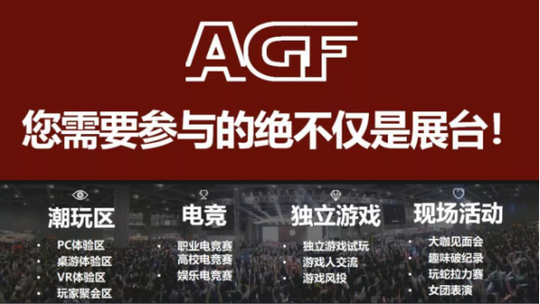 - 大概了解,那AGF有些什么? - 展会内容篇 ▼ -01- 展会现场:潮玩区域 从PC到主机,从VR/AR到桌游,从年度大作到精品小游戏,这里可以给到你最纯粹的游戏体验!除此之外,我们还组织了热门游戏的线下集会,这里不但有志同道合的伙伴一起玩耍吹牛,而且据可靠消息称,还将有不少不法份子,游戏开发者,特邀嘉宾,游戏大神等混入其中,不知道你们是否能从身旁玩家的言行举止中,将他揭发出来!