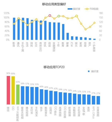 热血汉子兴趣多,游戏工作两不误 热血汉子不仅仅偏爱游戏,日常生活中同样离不开影音、通讯、工具、生活等App,相对整体互联网人群更加偏好阅读、工作和娱乐类应用;除了微信、QQ等维系社交的应用外,热血汉子还喜欢通过爱奇艺视频和腾讯视频满足追影需求。