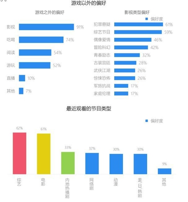追捧影视悬疑片,综艺栏目笑开怀 游戏佳人的休闲娱乐方式并不仅在于移动游戏,91%的她们还倾向观看影视,相对喜欢犯罪悬疑、综艺节目、偶像爱情、冒险科幻和青春励志等类型影视作品,最近观看较多的节目是综艺和电影;此外,她们对吃喝、阅读和游玩也有着较高的偏好。