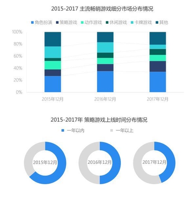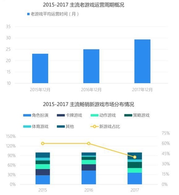 新作冲榜愈艰难,卡牌游戏持降温 老游戏凭借稳定的玩家基础和良好的运营支撑,将生命周期进一步延长,截至2017年12月,主流老游戏的平均运营时间接近30个月,这也间接增加了新上线游戏冲击榜单的压力,尤其是竞争较激烈的角色扮演类市场,而卡牌游戏的热度则继续退减。