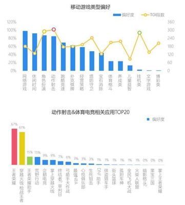 挥洒男儿青春气,动作射击燃激情 热血汉子整体较为喜欢网络游戏、休闲时间、角色扮演和动作射击类作品,偏好度均超过80%,TGI指数相对较高的则是动作射击、角色扮演和挂机类游戏;而从具体作品看,热血汉子较热爱MOBA的《王者荣耀》和FPS的《穿越火线:枪战王者》。