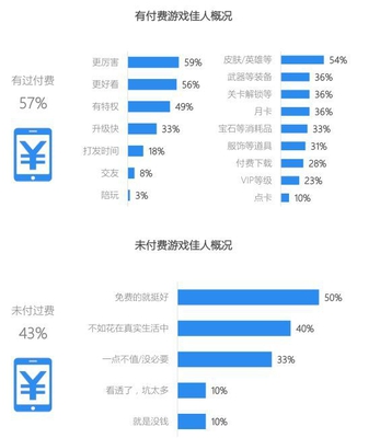 花费金钱求美好,真实世界亦重要 57%的游戏佳人曾为移动游戏买单,她们愿意将金钱花费在更厉害、更好看、以及皮肤/英雄等,比较重视游戏内的实力和装扮;43%的游戏佳人还未向移动游戏付费,有一半人以为免费的就挺好,40%的人则认为不如花在真实生活中。
