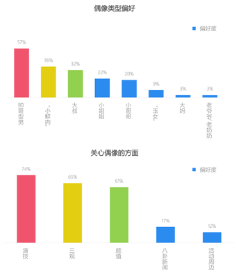 倾慕帅气英俊男,实力演技更重要 在偶像类型偏好方面,57%的游戏佳人更加喜欢帅哥型男,36%的人喜欢“小鲜肉”,32%的人喜欢大叔;在关心偶像标准方面,74%的游戏佳人比较在意演技,“戏骨、戏精、实力派”更受她们关系,65%的人在乎三观,61%的人则更看中颜值。