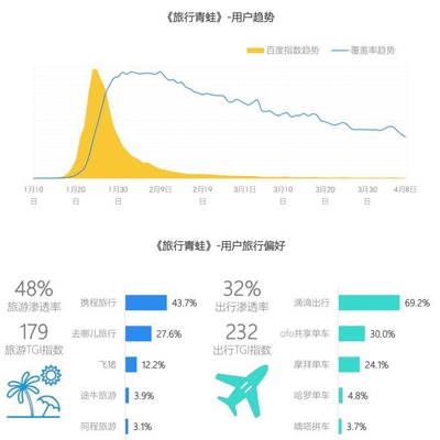 “呱儿”已失宠,旅行是真爱 2018年初,《旅行青蛙》风靡中国,被玩家视为“儿子”的小青蛙开始引爆朋友圈,从其百度指数和覆盖率变化趋势看,玩家养蛙的热度并没有长久维持下去,相比让“呱儿子”外出旅行,人们更在意本身的旅行,超过1/3的用户都会安装旅行应用。