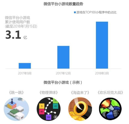 小程序游戏新机遇,产品轻量不轻松 微信等社交平台的小游戏,将在2018年成为一个新风口,依托天然导量的超级入口,充满想象空间的小游戏市场吸引很多开发者跃跃欲试。小游戏由于门槛低、玩法轻度,适应人们碎片化的移动互联网生活,而且能够利用社交平台的人际关系网络增进互动性。所以,小游戏市场存在着大机会。但是,目前小游戏的发展也面临着变现等问题,尽管某些小游戏已经在商业化上迈出第一步,但是如何取得玩法与盈利的平衡,以及处理与平台的利益分配关系,将使得小游戏战场变得风云诡谲。