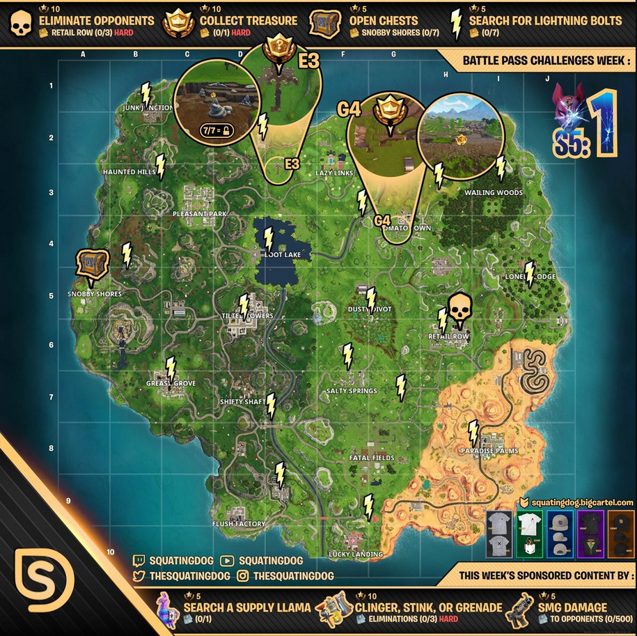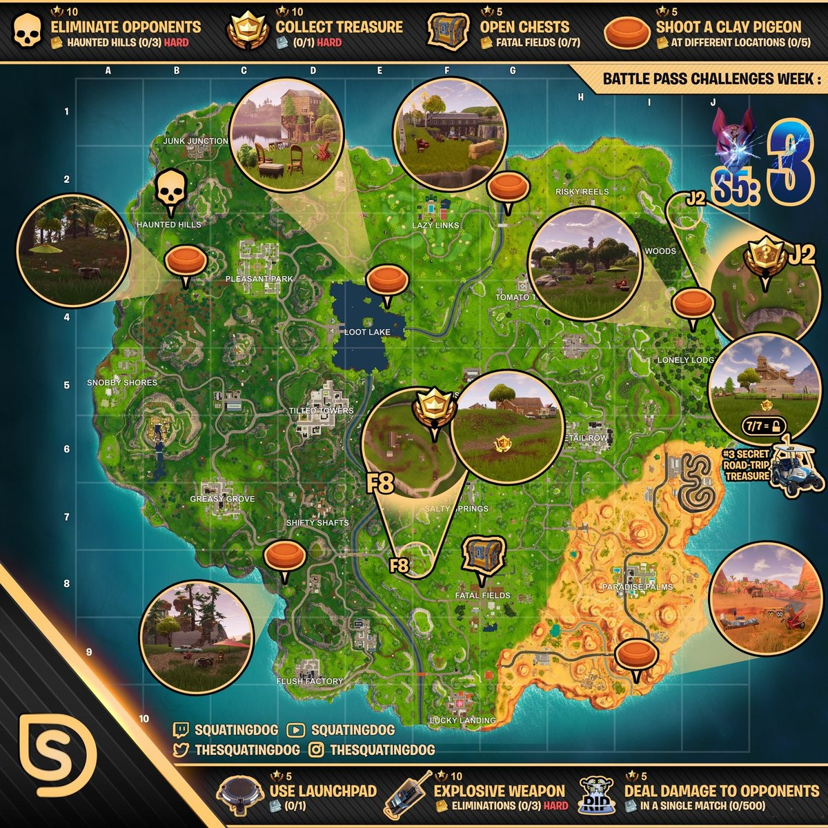 《堡垒之夜》第五赛季挑战任务攻略汇总,《堡垒之夜》的挑战任务每周四晚间更新,下面为大家带来第五赛季的挑战任务攻略。 第一周 免费挑战 对对手造成冲锋枪伤害500点。 搜索1只羊驼。 臭弹、手榴弹、黏弹消灭3个对手。(困难) 战斗通行证挑战 搜索海景别墅的箱子7个。 去各大城市搜索闪电标志7个。 跟随在露天影院找到的藏宝图寻找宝藏。(困难) 零售商场消灭敌人3个。(困难) 第二周 免费挑战 使用突击步枪对敌人造成1000点伤害。 在单局中搜索7个弹药箱。 淘汰棕榈天堂的对手3个(困难)。 战斗通行证挑战 在不同的篮筐中投篮得分5个。 搜索战利湖的宝箱7个。 在绿洲、石头拱门和恐龙之间搜寻(困难)。 狙击枪淘汰数2人(困难)。 第三周 免费挑战 在一场比赛中对对手造成伤害(500) 使用发射台(1) 跟随在马桶工厂找到的藏宝图 战斗通行证挑战 在致命领域搜索7个宝箱 在不同地点射中一个陶土飞靶(5) 消灭幽灵山的5个敌人 爆炸性武器消灭3个敌人 以上任务解完才会出现隐藏宝藏点(可以直接看图J2就是宝藏点) |