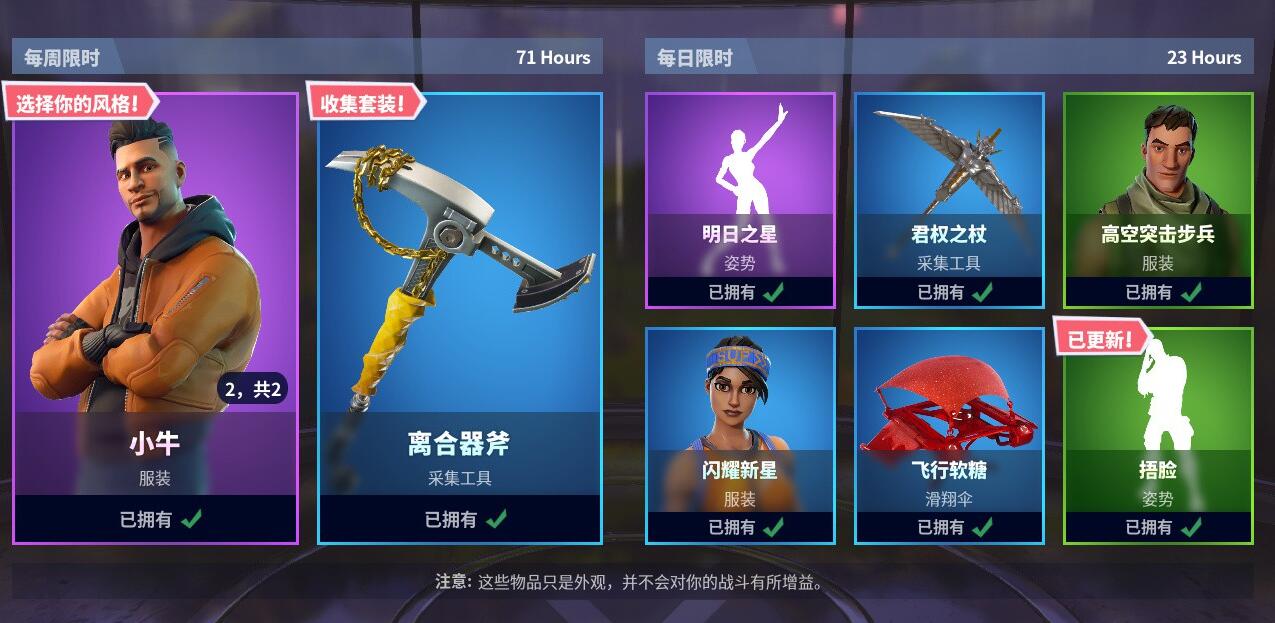 《堡垒之夜》商城今日上新,包含眼镜蛇队套装等内容。《堡垒之夜》商城每天都会更新道具,来看看有没有你喜欢的吧。 每周限时 小牛 离合器斧 每日限时 闪耀新星 飞行软糖 甜蜜的胜利。 高空突击步兵 明日之星 |