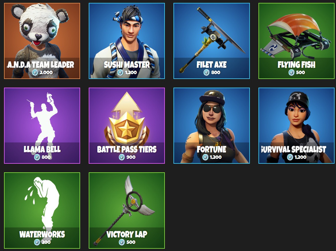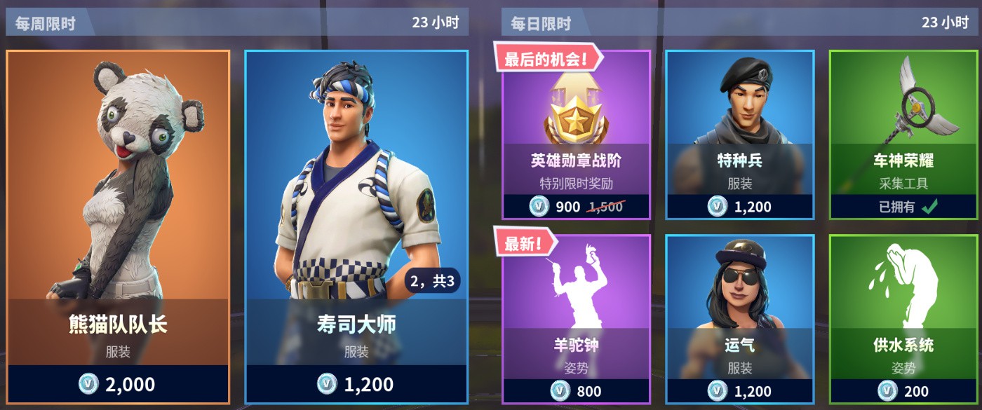 《堡垒之夜》商城今日上新,包含熊猫队长等皮肤。《堡垒之夜》商城每天都会更新道具,来看看有没有你喜欢的吧。 每周限时 熊猫队队长 寿司大师 菲力斧 每日限时 特种兵 运气 车神荣耀 |