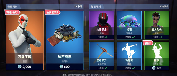 《堡垒之夜》商城今日上新,包含羊驼行动套装等。《堡垒之夜》商城每天都会更新道具,来看看有没有你喜欢的吧。 每周限时 万能王牌 破密高手 每日限时 火爆骑士 战术队长 忍者长刀 棱镜 |