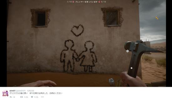 平安夜和圣诞节的“炮火”刚刚平息,不知道各位单身狗们有没有像小编一样被虐一脸...不过俗话说泥菩萨还有三分火气,最近一位日本单身玩家就用《战地1》宣泄了对情侣们心中的不满。 这位网名为shin01的推特用户把他的杰作发到了网上,多亏了《战地1》强大的游戏引擎,让他可以实现一些自己的想法。首先他在游戏中建筑的墙上留下了一串弹痕,而痕迹则是一对如胶似漆的情侣形象。 接着他拿出了炸弹埋在附近然后慢慢后退。 最后,duang的一下,这对“情侣”连同建筑一起上天了,这里不得不感叹一下游戏的破坏效果真的很强大。 |