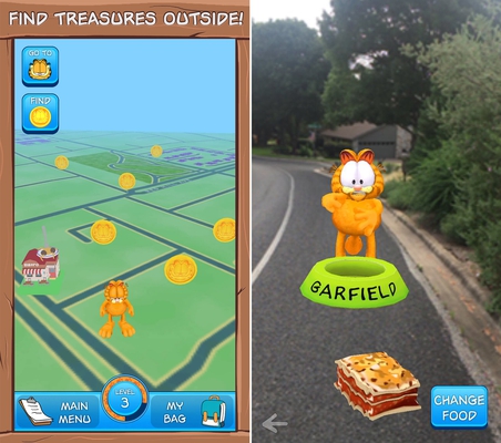 被称为“增强现实寻宝游戏”的《加菲猫GO》让玩家在世界各地散步,收集真实世界中的硬币并搜寻宝箱。使用增强现实技术,玩家甚至可以向加菲猫身上扔出千层面,不禁让人想起《精灵宝可梦:Go》中的精灵球。