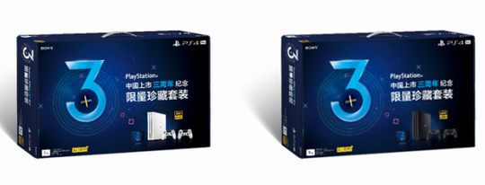 套装包含PS4 Pro主机(黑色/冰河白)一套、DUALSHOCK4无线手柄三周年纪念版(黑色/冰河白)一支、PS4直立架一个、PS Plus三个月会员卡一张,以及PlayStation中国三周年纪念明信片一张。其中黑色320套和冰河白320套,售价为3499元人民币。