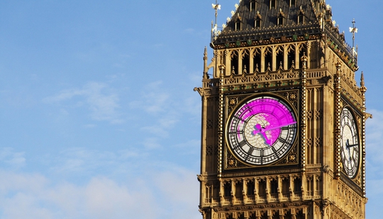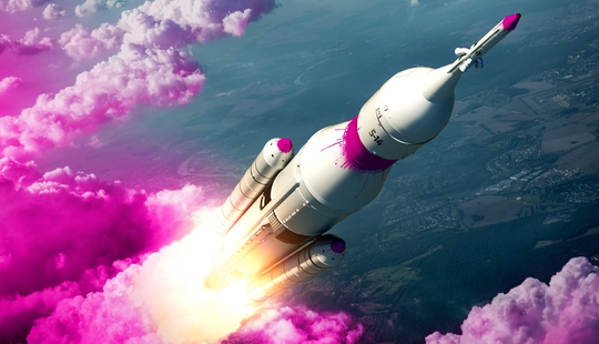 在第一张图片中,英国的大本钟被涂上了粉色的颜料,钟表的指针指向5点14分。第二张图片显示的是一枚飞行中的火箭,火箭被涂上了粉色颜料,还喷射出了粉色的烟雾,火箭外面写着“5-14”的字样。第三张图片中虽然没有文字信息,但仍然是以明亮的粉色为主题。