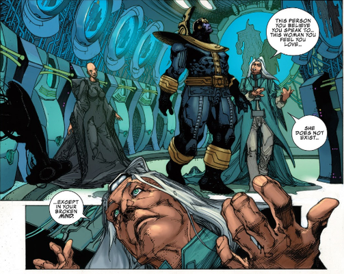 而这时死亡却追了上去,献上了萨诺斯渴望的一吻。昔日如天堂一般的家园现在被乌黑的烟雾笼罩着,整个星球都陷入了黑暗。被死亡环绕的萨诺斯等待着体内那束不曾熄灭的欲火逐渐平息,等待着自己疑惑在这个吻后得到解答。萨诺斯的嘴唇上依旧残存着死亡女神的味道,但是她的吻却显得如此冰冷,刚刚拥抱过她的身体也满是空虚和孤独。