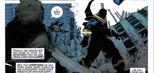 如今,每到太阳的活动周期,都会有一个孤独的拜访者来到这个充满了废墟的星球,身边的死亡早已不能得到他的青睐。他是毁灭者,一个疯狂残暴,又沉溺于杀戮的泰坦人。他舍弃掉了自己的名字,随之诞生的却是一位神灵,他有着光念出来就足以让全宇宙颤栗的名号:灭霸。