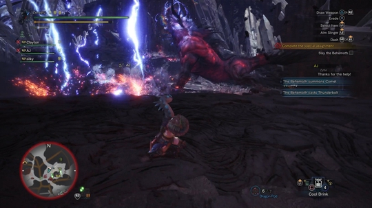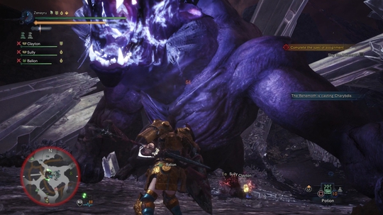 值得一提的是,你可以对贝希摩斯使用闪光弹,不过这样做会打断队友的嘲讽状态。因此闪光弹最好用在贝希摩斯抓起玩家的时候,或是用来打断它的大漩涡。