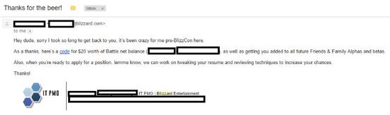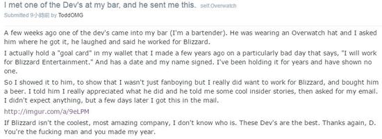 暴雪作为全球游戏行业龙头之一,他们的企业文化和各种趣事也被无数人津津乐道。近日,有位国外网友在Reddit守望先锋板块发帖,称他在酒吧遇到了暴雪的工作人员,并且分享了随后的趣事。 译文如下: 几周前一位暴雪的工作人员来到我工作的酒吧(我现在是一名调酒师),他戴着有守望先锋LOGO的帽子,我问他在哪买的,他笑了笑说他在暴雪工作。 那时候我的钱包里有一张纸条,是几年前写下的,上面写着:我将来会在暴雪工作。签上了名字和日期。这么多年了我一直揣着没给别人看过。 我给了他一瓶啤酒,把纸条拿出来给他看,告诉他我不是一名单纯的粉丝,我是真正想要在暴雪工作,很感谢他们做出那么多经典的游戏,他也给我讲了很多暴雪公司有趣的事情,最后他要了我的邮箱,给了他之后我也没有多想。 几天后我收到了他的邮件。 译文如下: 谢谢你招待的啤酒。 抱歉过了这么长时间才给你发邮件,你知道在暴雪嘉年华前夕很忙。 为了表示感谢,这里有价值 $20 的战网点,而且你可以参加未来所有的游戏α/β测试。 另外,如果你准备好了申请你的职位,告诉我们,我们会根据你的履历和技能来进行调整,增加你成功的机会。 感谢。 在帖子的最后作者表示,如果暴雪不是世界上最coooooool的公司,那还会是哪家呢? |