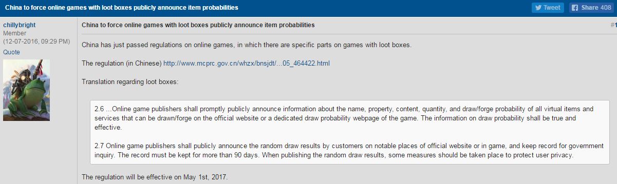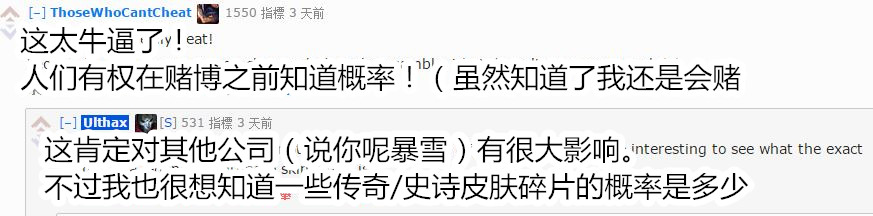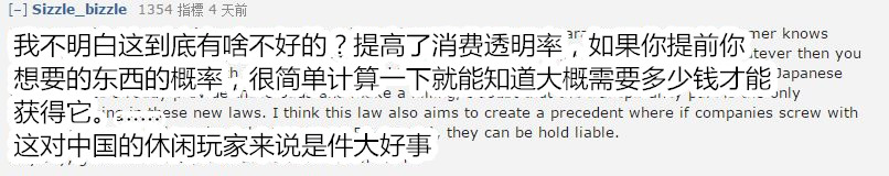 不久前,文化部发布了《文化部关于规范网络游戏运营加强事中事后监管工作的通知》,《通知》中明确了网游运营规范。其中最受关注的规定包括“随机抽取不得直接投入法定货币或虚拟货币,应公示抽取或合成概率”,以及“企业不得向用户提供虚拟道具兑换法定货币的服务”等条例。 简单地说,未来网游、手游开箱子、合成、抽卡等必须公布概率。 这一新规公布后,中国玩家喜大普奔!纷纷表示干得漂亮! 中国网友评论: @德玛西亚骨科医院:领导有没抽到ssr,是时候整顿一波了。 @Ou1ja:腾讯股价暴跌90% @义降正天:阴阳师坑爹爆率早该明示。 @阿施特拉耶夫:概率公开了也不会变高啊,抽不到还是抽不到。 @病痊愈毛歪歪:@网易阴阳师手游请有关公司认真贯彻执行,组织力量对旗下游戏进行自查,逐条梳理存在的问题,及时公示整改进度,相关工作情况请于本月前在游戏公示栏中进行公示,接受玩家监督。 随后,这则资讯被人翻译转发到了国外游戏论坛NeoGAF上,“中国规定网游必须公布开箱概率”。 毕竟一些国际性质的网络游戏,中国一旦公布概率,其他地区的玩家也会跟着受益。帖子一出,老外玩家们喜大普奔,纷纷称赞! 他们在论坛惊呼:中国才真正关心游戏消费者!有的老外玩家甚至开玩笑地引申到中美竞争…… 现在一起来看看,国外友人怎么看待这件事的: 也有人感谢中国,及时拯救了玩家剁手的节奏。 这则帖子随后被转到国外贴吧Reddit的很多游戏版块上:守望先锋、炉石传说、反恐精英GO、游戏版等,每条点赞数都上千,甚至上万。 国外玩家纷纷点赞这条规定,都对中国玩家表示羡慕嫉妒恨。 ![]() 外国网友评论(点击图片查看大图) ![]() 外国网友评论(点击图片查看大图) ![]() 外国网友评论(点击图片查看大图) ![]() 外国网友评论(点击图片查看大图) ![]() 外国网友评论(点击图片查看大图) ![]() 外国网友评论(点击图片查看大图) 有人计算了下2015年直播中开的箱子,反恐精英刀子的概率只有0.0041%,所以折射到其他游戏上,让不少玩家细思极恐! |