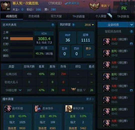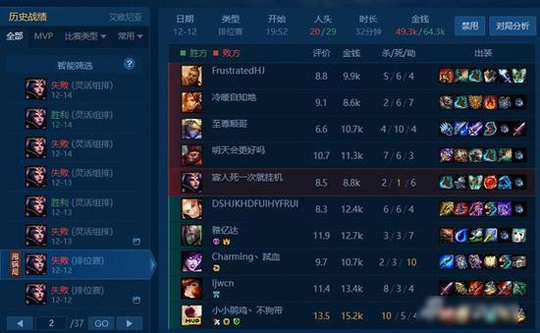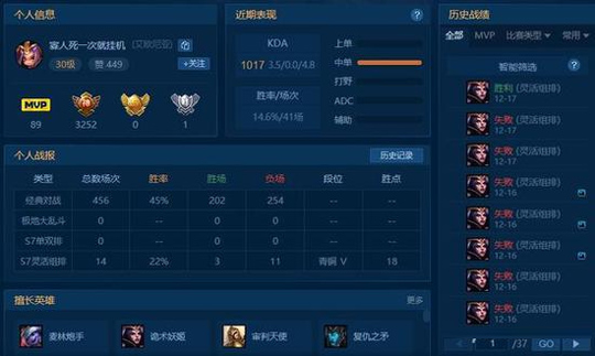 相信不少玩家都知道,《英雄联盟》国服有一位非常奇葩的玩家,他的ID叫做:寡人死一次就挂机!而且他也用实际行动证明,他真是人如其名!他所有以往的战绩中,几乎都保持着超高的KDA,以往他从来没死过,这确实是真的,至少翻了他几十页的战绩,基本上被击杀数均为0,虽然比赛有胜负,但是这并没有打破他死亡的金身。 如今到了S7赛季,这位奇葩玩家又怎样了呢? 最近我们查了他的战绩,发现他目前已经打完了定位赛,看来新赛季又会再次在青铜段掌控雷电,但是KDA依然高的惊人! 不过在查看最新的战绩时,我们发现他在12号的一场排位中,不死金身终于被打破了! 在这场比赛中,这位大神还是用的乐芙兰(这家伙真的一直在用妖姬),而对面的阵容如下: 这场比赛持续了30多分钟,而杀死这位大神的就是一个瞎子玩家,不知道这场比赛他有没有挂机呢?毕竟死一次就挂机嘛! 看来这位支配青铜段位的皇帝也有马失前蹄的一天啊! |