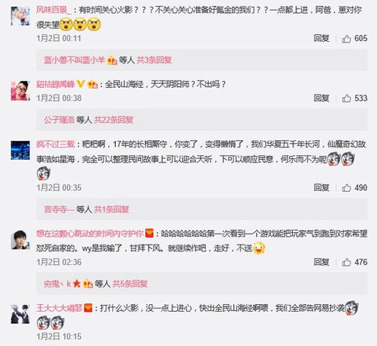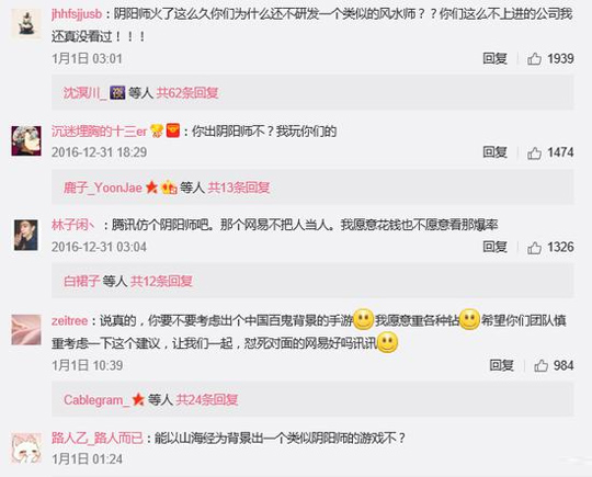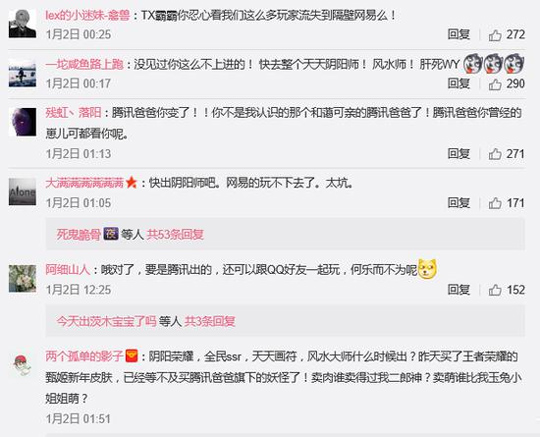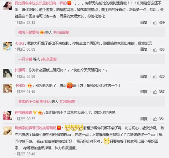 相信关注《阴阳师》的玩家都知道,最近游戏推出了全新的姑获鸟皮肤“金鸾羽鹤”,但由于活动爆率太低,这个活动引起了无数玩家不满。不少玩家甚至跑到腾讯游戏的微博下方评论,希望腾讯出一款类似的游戏。有人批评道:阴阳师都这么火了,腾讯还不抄,我真是从没见过这么懒惰的公司! 其实事情的由来非常简单:《阴阳师》的姑获鸟新皮肤可以在日常副本和漫展两个途径获取,这也引发了全民在线肝副本的狂潮。尴尬的是由于爆率太低,同时频道中一直提示的xxx获得神眷,奖励新皮肤等消息刺痛了广大非酋们的神经...(目前已经延长活动时间,并不再在世界频道进行公告) 下面是《阴阳师》玩家在腾讯游戏微博下的评论: 不过话说回来,大部分这样做的玩家或许只是一气之下说出的气话。仔细想想,如果腾讯出了阴阳师山寨版,那情况真的能像玩家所说的这样么? |