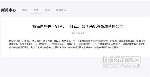 昨日,“国民老公”王思聪旗下的熊猫TV发布了一条公告,在公告中明确指出即日起熊猫TV内将禁播GTA5、H1Z1、黎明杀机等六款游戏。 公告表示,根据文化部“不提供《侠盗猎车5》,《如龙》,《热血无赖》,《H1Z1》,《黎明杀机》,《十三号星期五》等含有禁止内容的游戏”的要求,熊猫直播即日起,停播《侠盗猎车系列》、《如龙系列》、《热血无赖》、《H1Z1》、《黎明杀机》、《十三号星期五》六款游戏。 早在去年11月时国家互联网信息办公室就已发不过《互联网直播服务管理规定》,限制各大直播平台主播的游戏内容。从目前熊猫的反应来看,这一规定已开始逐步实施,相信距离全网实行的日子也不远了。遗憾的是,或许以后我们就无法再看到主播们玩这些游戏的精彩表现了。 |