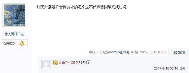 近段时间,人气女主播冯提莫由于长时间停播,外界也出现了各种关于她将要跳槽的传言。而对于这一消息,无论是平台还是冯提莫本人都没有做出正面回应,冯提莫最终的去向也牵动着无数粉丝的心。 虽然今天冯提莫在微博表示15号将会开启直播,但前几日她在直播间与网友们弹幕互动时就曾表示,这次复播是因为之前已经签好了约。所以从这点来看,这次复播不代表冯提莫已经续约。 不过今天凌晨,贴吧突然出现了一篇名为“别带节奏了,明天开播”的帖子,怒斥最近在网上带节奏的人,而这篇帖子的发布人名为“斗鱼TV_CEO”。在帖子中表示:“说的是谁,你们清楚”。 对于网友的质疑,他则以短短的三个字回复道: 网友对于这次爆料的看法分为两边,一部分网友认为这次可能提莫与斗鱼真的续约了,而另一部分网友则认为这是平台在利用提莫合约期最后一点时间精心策划的一次炒作。对于这两种观点,各位小伙伴认为哪一种更靠谱? |