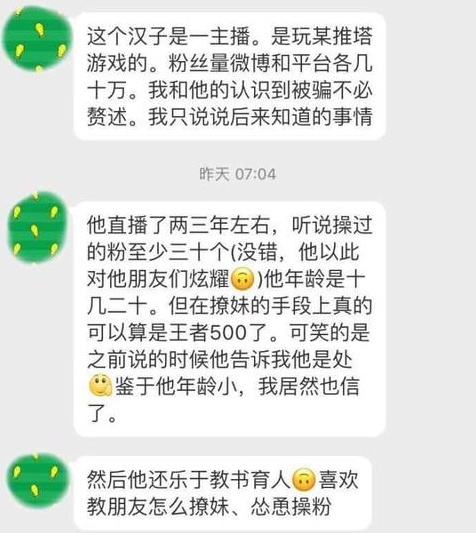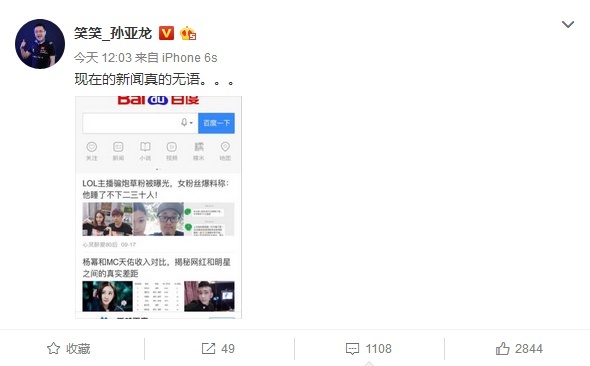相信提起LOL德云色主播笑笑大家都不会陌生,此前他曾因为不实资讯大骂某媒体编辑,而今天中午笑笑又发表了一条微博表示对现在的资讯感到无语。 上图可见,笑笑竟收到了一则主播“骗炮”的资讯,并且配图中竟然有他自己的照片!这就很尴尬了,难道笑笑这个浓眉大眼的秃老哥也叛变了? 但其实这篇文章说的主角并非笑笑,而是另一位主播,有网友放出了这则资讯中爆料者的对话截图: 根据爆料内容来看,粉丝们似乎已经确定了这条资讯爆料的主角: 而在笑笑这条吐槽微博的下方,粉丝们纷纷留言表示: 这次笑笑可以说是无辜躺枪了,不过也正如粉丝们所说,笑笑粉丝虽多,但其中女粉有多少,大家心里应该都有点X数吧... |