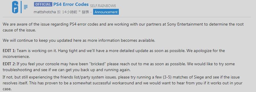 育碧于昨日推送了《彩虹六号:围攻》的更新包,然而众多PS4用户反映在下载更新之后出现了系统崩溃的情况。对此育碧在Reddit论坛上发帖确认,玩家在更新《彩虹六号:围攻》后出现软件报错或系统崩溃的情况属实。从置顶帖的更新内容来看,虽然育碧目前还没查清原因,不过也在一定程度上找到了解决方案。 以下为育碧官方置顶帖原文: 我们已经注意到了会引发PS4错误代码的问题,现在正和我们的合作伙伴索尼娱乐查明问题的根源。如果有更多消息我们会在本帖中更新。 更新1: 我们的团队正在处理这个问题。多加留意,我们会尽快更新更多细节。对您造成的不便我们感到非常抱歉。 更新2: 如果你发现自己的主机已经“变砖”了,请立刻联系我们。我们会尝试一些排错方法,看看我们能否恢复您的主机,让它重新运转。 如果主机没出现问题,但是碰到了好友列表/派对系统方面的问题,请尝试先打几局(3-5局)《彩虹六号:围攻》,看看能不能解决这个问题。一些实例证明这是个解决办法,如果您在实践后的确可用也请知会我们。 了解更多相关信息,请前往http://pc.yzz.cn/ku/rainbowsixsiege |