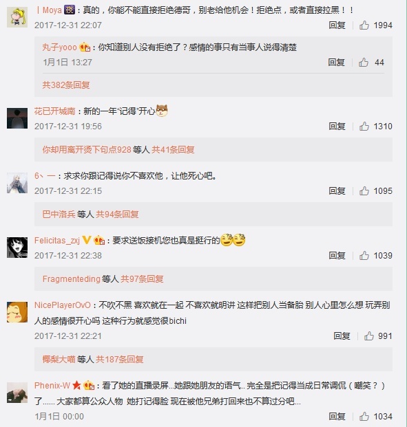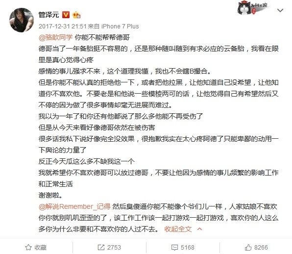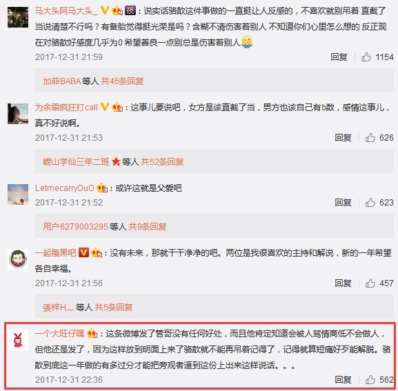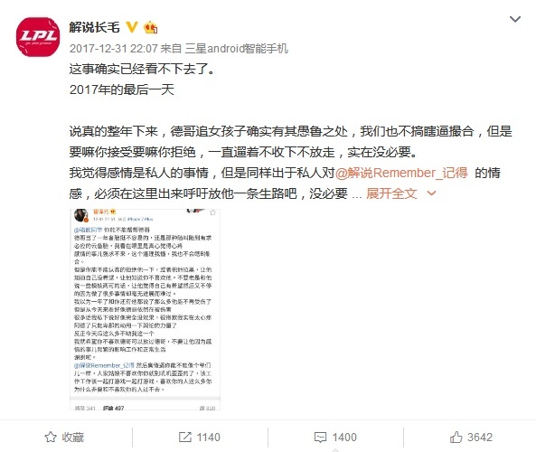 2017年的最后一天对于《英雄联盟》的玩家们来说是个热闹的日子,在当日晚9点51分,LPL解说管泽元在微博上公然炮轰女主持骆歆,为同为LPL解说的Remember记得抱不平,甚至喊话女方表示:“希望你不喜欢他的话能够放过他。” 在15分钟后解说长毛也前来声援,发微博向骆歆开火: 在公然开撕后,泽元也在微博下方评论中表示出此下策完全是出于无奈,因为“在私下说了一年都没有用”,但想要解决事情的话就“总要有个人唱白脸”逼他们都能继续往前走: 对于管泽元这次非常冲动的举动,网友们在指责之余也表示理解,甚至还有网友表示:“骆歆到底这一年做的有多过分才能把旁观者逼到这份上出来这样说话。” 在泽元和长毛的微博发出后不久,骆歆的微博也被大量愤怒的网友“爆破”: 而在事发时正在直播与闺蜜跨年的骆歆在得知这一消息后表现得有些不知所措,稍稍整理了一下情绪后她在直播中也对此事做出了回应。 她表示:“这段时间有考虑要不要尝试和他在一起,但大家这样一搞我觉得他性格有些太小孩子的地方,可能这就是我们不适合的地方。”在说完这些之后,骆歆便匆匆的下了播。 尽管泽元和长毛都表示这件事的有效期仅限当晚,到了2018年后就不会再讨论,但截止发稿时骆歆的微博下方依然有不少新的留言来指责她。 在最后小编想说,虽然泽元和长毛的做法有些欠考虑,但站在兄弟的角度来看,长期苦劝无果的情况下为自己的兄弟打抱不平也无可厚非。而骆歆方面或许也有她自己的问题,不过归根结底感情的事都是两个人的私事,希望大家能理性吃瓜,文明发言。 退一万步来讲,万一记得本来是有机会的,但就因为喷子们把小姐姐喷得心态爆炸把这事儿搅黄了,那岂不是更加可惜? |
