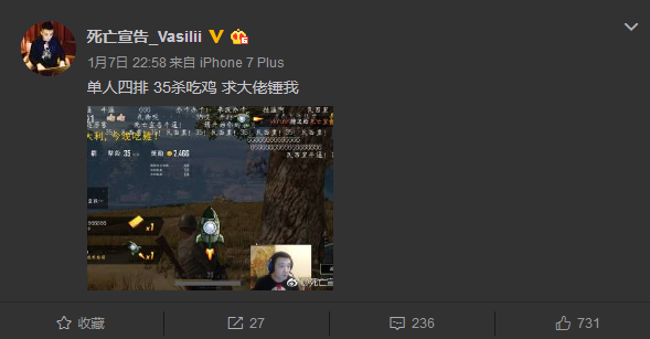 昨日(1月7日)晚上,死亡宣告在微博中发出了一张《绝地求生》吃鸡直播截图,图中赫然显示着“35杀”的字样。而死亡宣告本人也表示:单人四排,35杀吃鸡,求大佬锤我。 在此前的家暴事件被拳头禁赛、俱乐部解约、平台封杀之后,宣告彻底离开《英雄联盟》开始转战《绝地求生》。不过在转项目之后的宣告可谓是如鱼得水,不仅技术提升得飞快,并且也收获了无数粉丝的支持。对于这次宣告打出惊人的35杀吃鸡战绩,网友们却纷纷表示不敢锤。 而且在评论区中,此前一度疯传被宣告“殴打”的女友也赫然在列,并表示这次的战绩其实是她操作的。从这一点来看两人目前应该还是处于同居状态并且感情稳定,或许可以确定宣告此前被传“殴打女友”一事真的没有发生。 不少网友也在评论区中为宣告抱不平,认为人家女朋友都已经出面澄清了,还有不少喷子抓着这一点不放,带有色眼镜看人。 虽说之前的冲动表现让宣告吃过不少苦头,但在离开LOL转战吃鸡后宣告的表现的确令人惊喜,也算的上是又一个成功转型吃鸡的前LOL职业选手。不知各位小伙伴怎么看宣告这段时间的改变呢? |