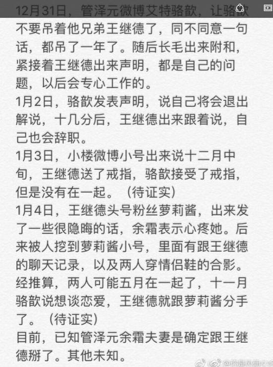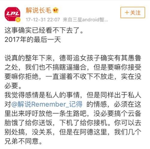 LOL官方解说“Remember记得”与“骆歆同学”同时发布微博公开恋情,这一举动却遭到了全网狂喷,甚至有网友称之为“2018电竞圈最大反转”。 翻看了相关的系列微博,其实不难搞清楚网友为何如此群情激奋。记得在这一年以来一直保持着对骆歆的追求,但骆歆似乎一直将他放在一个备胎的位置,召之即来挥之即去。这让记得的兄弟管泽园以及长毛愤怒发博开撕骆歆,这件事情闹得很大,骆歆和记得还曾发布过辞职声明。 热心网友整理出了时间线,疑似在十一月的时候,因为骆歆说自己想恋爱,记得就与自己的女友分手了。 不说别的,记得这一波宣布恋情的确狠狠打了管泽园和长毛的脸,随后被爆出来的聊天记录更是让吃瓜群众目瞪口呆。 以下疑似截图均来自网络: 龟龟,如果记录属实,那这波可真是天秀啊。对于记得这种“见色忘义”的行为,网友一阵狂喷,表示这是骆歆的洗白手法,坐等两人几个月之后分手。 “我的老二让我选她”这个梗目测会变成18年电竞圈热词top3,如果remember再来解说比赛,估计弹幕会被这个梗刷爆。 有网友已经捋出了骆歆的洗白方法:与记得在一起,然后过几个月分手。记得与她在一起几个月也不亏,毕竟“我的老二让我选她”。只是可怜了管泽园和长毛,满腔热血为兄弟出头,最终却落得这个下场。 对于这场电竞圈开年大戏大家怎么看呢?对于记得和骆歆的恋情,你会选择祝福吗? |