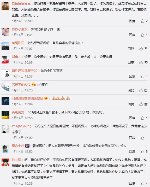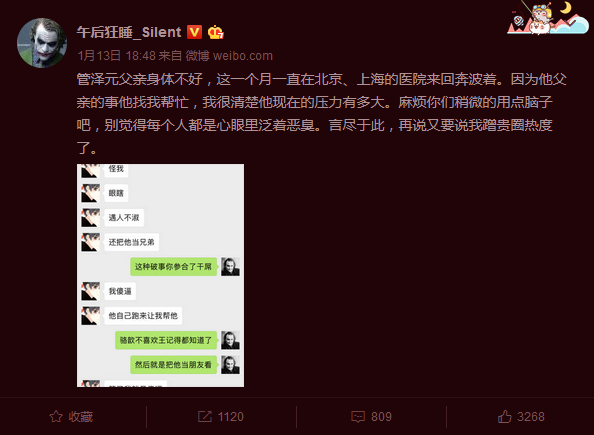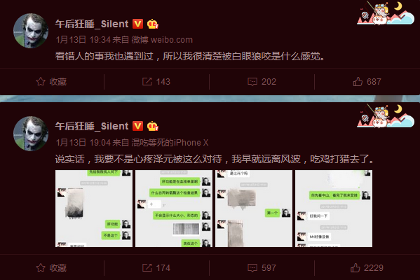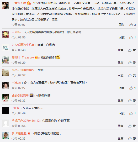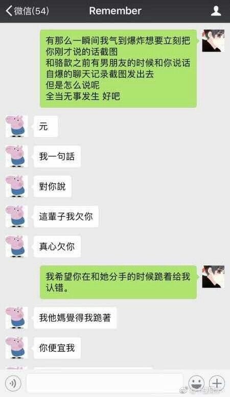 相信不少LOL玩家都知道,最近的LPL解说王继德和主持人骆歆之前的感情大戏,“沉迷骆歆”的记得也让网友和同事们操碎了心。不过就在1月13日下午,骆歆和记得双双在微博上发出了一句“谢谢你”疑似暗示在一起,这也让不少吃瓜群众当场懵逼。 不过相比起懵逼的我们,更尴尬的莫过于是记得的好兄弟长毛和泽元、余霜夫妇。当初他们替记得鸣不平,甚至不惜公开炮轰骆歆让她难堪,但现在两人在一起后,之前这样做的几个人的处境想想都觉得难受! 或许是被愤怒冲昏了头脑,管泽元一怒之下直接爆出了与记得的聊天记录,看完之后小编是觉得有些辣眼睛,各位不妨自行感受一下: 聊天记录曝光后,不少网友和圈内人士指责管泽元“没素质”,认为他再怎么样也不该曝光好友的聊天记录,一时间管泽元从“正义使者”变成了千夫所指的那个人。 面对这种情况,看不下去的圈内人士姥爷(微博午后狂睡_Silent)在微博上声援了一波管泽元,并曝光了二人的聊天记录: 但事已至此,骆歆在王记得的帮助下成功洗白,而王记得也成功抱得美人归,反倒是最初声援记得的管泽元和余霜弄得里外不是人。其中的是非恩怨和来龙去脉或许只有当事人才清楚,不知各位小伙伴对此事怎么看?欢迎说出你的想法! |