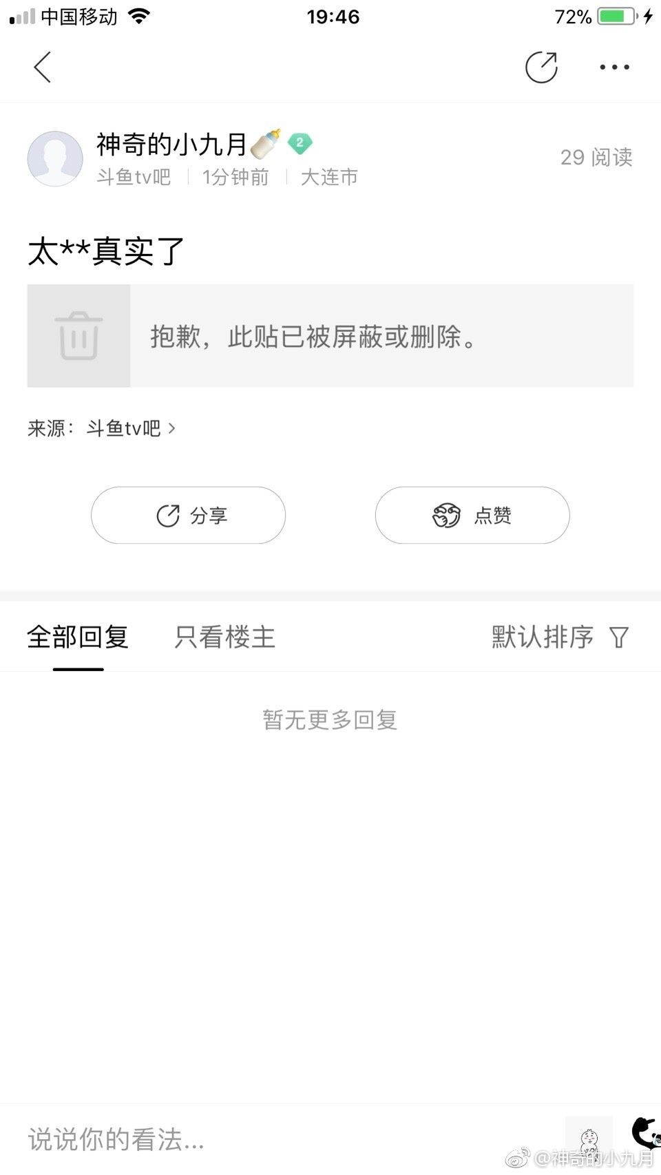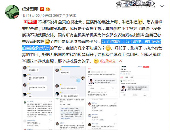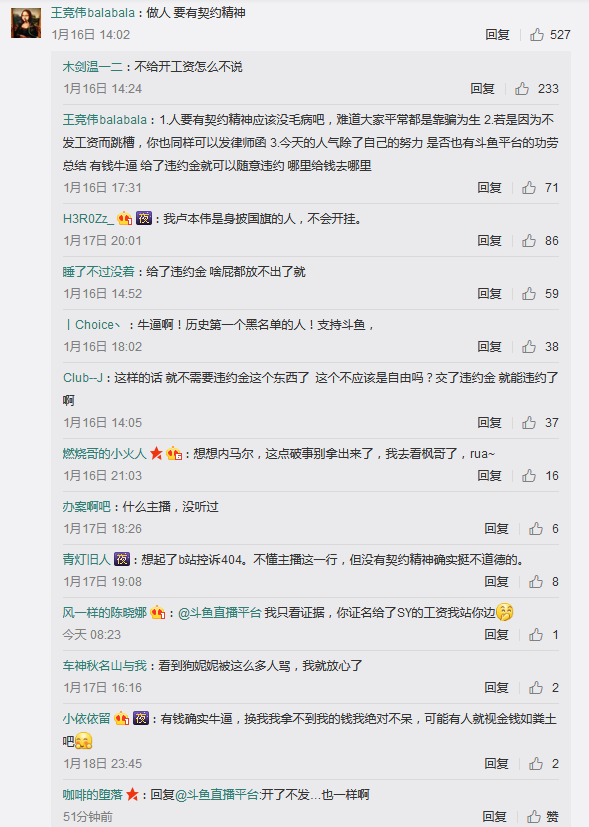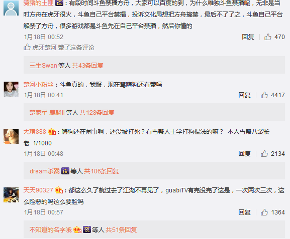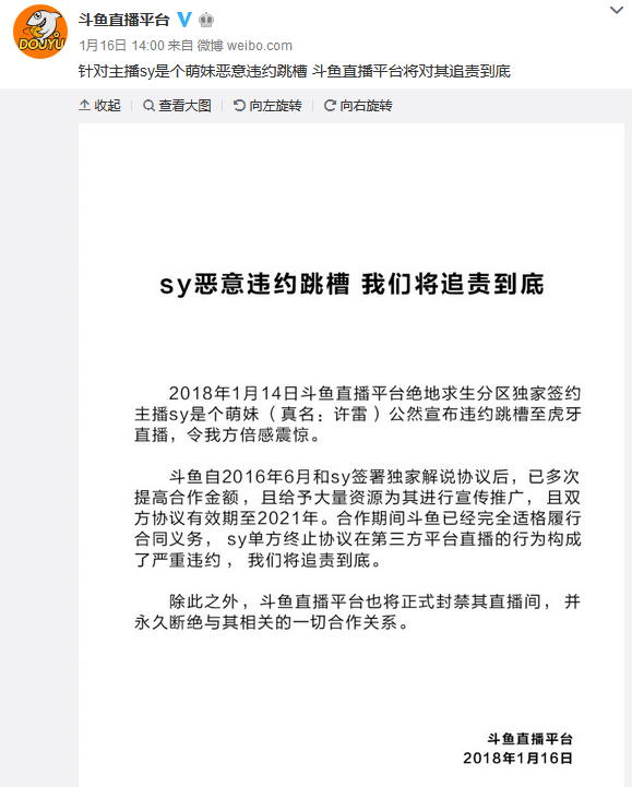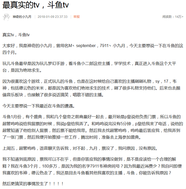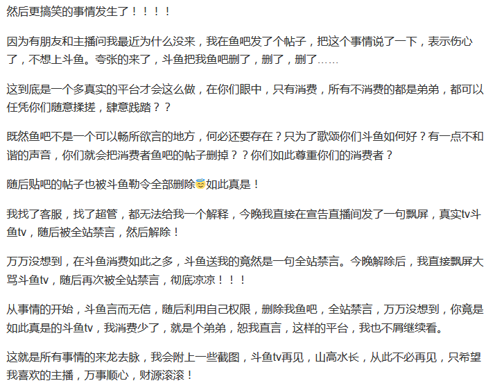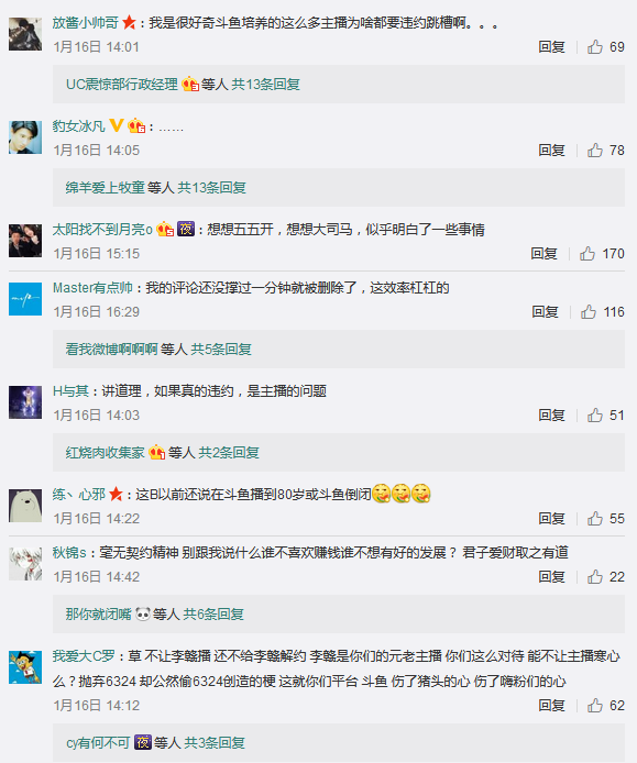 近日,斗鱼旗下《绝地求生》主播“SY是个萌妹”跳槽一事引发了广大网友的讨论。1月16日中午,斗鱼官博发出公告,称SY恶意跳槽并将追责到底,在公告的评论区里网友们也吵得不可开交。 首先抛开这件事究竟是主播恶意跳槽还是平台打压,但从评论中来看,有不少留言的水军嫌疑非常大,有兴趣的小伙伴可以自行前往官博下方查看。 在这件事的热度持续发酵后,此前曾签约斗鱼的主播楚河在昨天凌晨爆出了斗鱼的黑料,表示“海鲜台为了抄热度,为了炒作,连自己家的主播都会坑杀”,并称其为“我见过最蠢的平台”。 相比起SY跳槽的微博,楚河这篇微博下方的评论就要“真实”不少。 抛开与主播“撕逼”不说,海鲜台就连自己的铁杆观众也不放过。1月9日,一位微博名为“神奇的小九月”的网友发表了这样一篇帖子: 在帖子下方,九皇还PO出了自己与斗鱼工作人员的聊天记录和被禁言、删帖的截图。 身为一个砸了近200万的皇帝级观众都受到如此待遇,很难想象在其他普通观众遇到类似事情的时候会被如何对待。 在去年鱼乐盛典开始前至今海鲜台的资讯就从未停止过,先有一哥五五开涉嫌开挂、教唆粉丝辱骂观众,再有“科学家”蛇哥,之后还签下了臭名昭著的死亡宣告。随着LOL区“最后的排面”德云色出走,不知有多少小伙伴已经卸载了斗鱼? |
