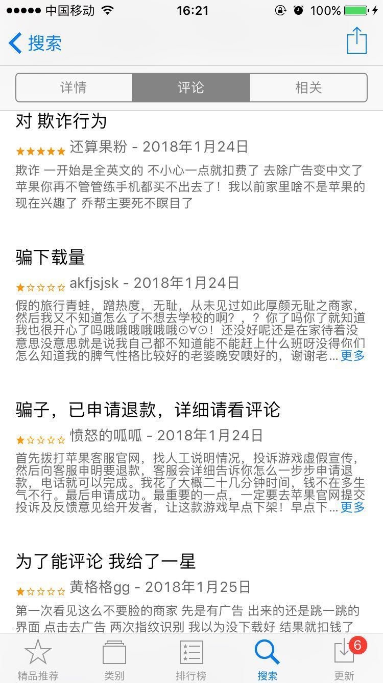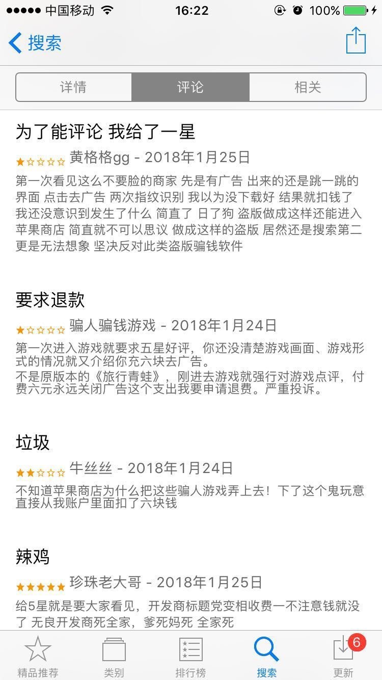 近段时间,相信不少小伙伴都被一款叫《旅かえる》的游戏洗脑,并且朋友圈也被各种该游戏的相关消息刷屏。不得不承认,虽然这款游戏至今没有推出官方中文版,但是却在中国一夜爆红,连游戏的制作人都表示“感到不可思议”。 这样一款成功的游戏,又尚未推出官方中文版,自然也就让不少无良制作者动起了歪心思。今日,有网友发现一款名为“旅行青蛙-中文版.”的游戏上线了AppStore。 虽然该游戏在美术风格上极力的向《旅かえる》靠拢,但在玩法上却基本与微信上的“跳一跳”一致,并且游戏中加入了付费广告,每次重新开始游戏都需要观看广告,严重影响游戏体验。 而令人啼笑皆非的是,这样的一款“李鬼游戏”却吸引了不少玩家下载!在评论区中,这款游戏受到大量玩家谩骂: 从目前的游戏市场来看,《旅かえる》在本土市场上的表现非常平庸,但是最近在中国市场的影响下开始飙升,一度升到免费榜前20的位置。但遗憾的是,目前游戏仍然没有推出中文版,这也给了不少无良制作人可乘之机,希望作者能够早日加入中文版本,回馈一下帮助这款游戏爆红的中国玩家! |