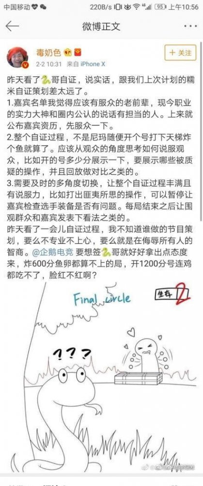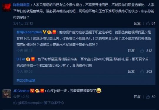 昨日,饱受“开挂”质疑的主播蛇哥在企鹅电竞展开了新一轮线下自证直播。不过这次自证的效果同样不好,因为蛇哥居然拿出了600分左右的账号,在比鱼塘局还要鱼塘的“鱼苗局”完成了自证,用这次担任裁判的LGD《绝地求生》分部教练梦晴原话形容就是:“智商受到了侮辱”。 对于蛇哥的这次自证,电竞圈老前辈黄旭东在微博吐槽了一番,不仅表示这次蛇哥的自证和上次他们为糯米准备的策划差得远,同时还认为企鹅电竞的态度有问题: 不过这条微博发出后不久疑似遭到了公关,随后该微博便被删除。不过除了删除掉的这条微博之外,黄老仙其他几条吐槽蛇哥的微博并没有删除,其中就包含蛇哥自证所使用账号的战绩截图。从战绩中来看,在2月1日晚自证之前,这个号一直在被用来掉分。 除了黄旭东之外,作为嘉宾出席的LGD绝地求生教练梦晴也在微博上透露了对这次自证的不满。 对于有部分网友质疑梦晴以职业选手的角度要求蛇哥,他本人则是这样回复的: 就在今天上午,删掉质疑蛇哥自证微博的黄旭东也再次“发功”了: 根据老仙以往“生死人、肉白骨”的功力,蛇哥接下来估计是要凉了。不知对于昨日蛇哥鱼苗局自证的操作,各位小伙伴怎么看呢? |