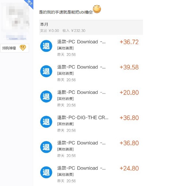 在本月2号晚上,育碧Uplay商城出现了奇妙bug,各类大作均可一折购买,很多玩家都以30多元的超低价格购买到了《刺客信条:起源》、《孤岛惊魂5》等等育碧旗下大作。虽然很快这个bug便被修复,但依然有手快的玩家把育碧商城的所有游戏都“清空”了。 不过你以为靠临时出现的bug就能薅育碧的羊毛吗?事实证明是想多了,今日在贴吧已有网友爆料,育碧已经开始进行强制退款流程。 不过强制退款流程可能是人工手动进行,而在出bug期间买游戏的玩家实在太多了,所以目前官方还未对所有玩家进行退款。此外,即便你买到游戏已经下载,官方在进行退款后你也玩不了游戏,页面会显示需要购买。 |