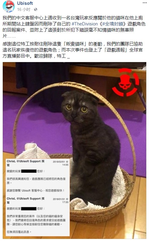 生活中,有时人们会因为“手贱”不小心搞砸事情,对玩家们而言误删游戏可以说再寻常不过的操作了。不过,下面这位玩家失去游戏却是因为自家的喵星人“手贱”了。 育碧官方今天刊登了一则趣事,上周育碧客服中心收到了一名玩家的回报案件,他表示家里的猫竟然乘自己上厕所之际爬到键盘上,把他《全境封锁》的游戏角色给删除了……而事后,这位玩家还晒出了“犯人猫”的照片。 对此,育碧官方内心都快笑翻了,不过他们还是感谢这位玩家没有冲动到去“删除”这只猫,并恢复了他的游戏角色,欢迎他回归“纽约特工”。不过对于猫而言,它当然是毫不知情,所以照片里才一脸“你瞅啥”的表情。 喵星人:搞清楚谁才是老大 猫居然把铲屎官的游戏角色删除了,这样的操作不仅让人哭笑不得,而且听上去有些天方夜谭,不过实际上还是有可能的,毕竟喵星人的小肉垫连触屏手机都能感应,操作一下键盘还是小菜一碟的。